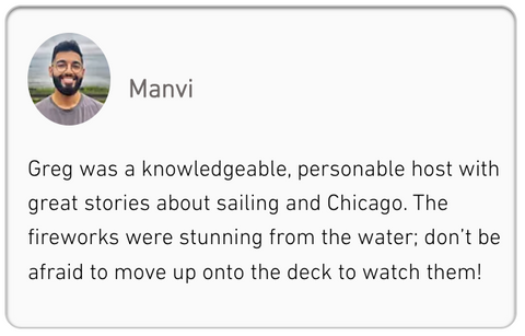 Embark on an unforgettable journey of sailing the Chicago Lakefront and be mesmerized by the views of the city lights and famous Navy Pier fireworks show. This evening cruise is simply magical. Enjoy a drink or two, Snap some photos, and listen to your favorite tunes with the city skyline as your backdrop. Then, prepare to be dazzled as you witness the spectacular fireworks show from the best seats in the house. All this and more from our 37' luxury sailboat.